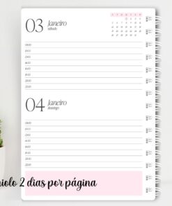 Opções de layout: 1 ou 2 dias por página, com ou sem horários