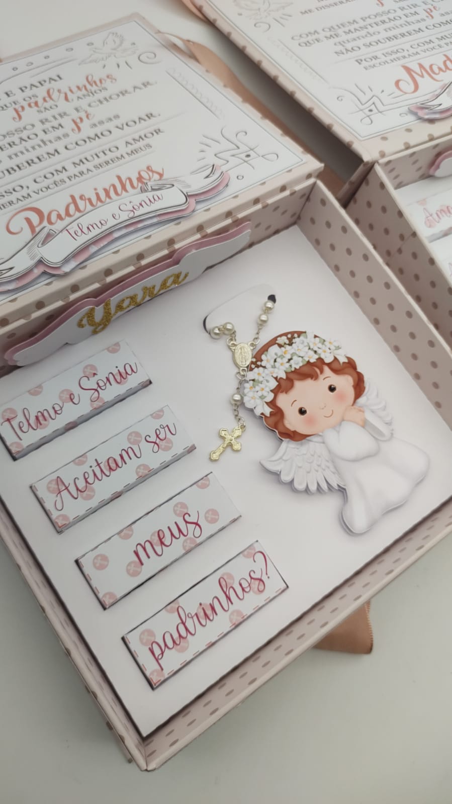 Atenção: A caixa quando é para convite de Batismo acompanha um tercinho de pérolas, caso seja de outra religião nos avise para que possamos retirar os furos de encaixe do mesmo.