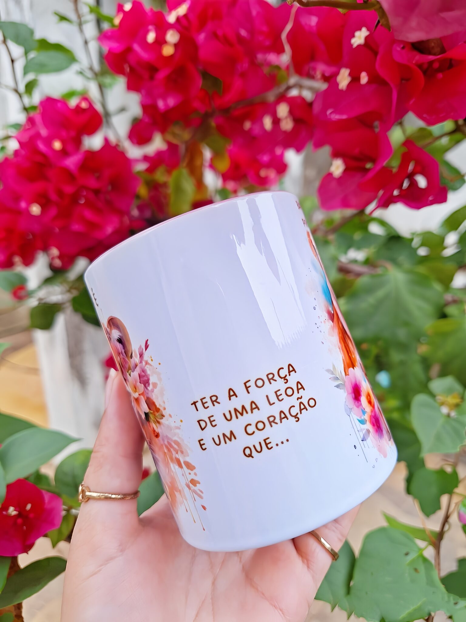 Caneca de Porcelana – Mães – Ser mãe é ter força de uma Leoa e o coração – Valor referente a caneca com aça e interior branco, para a colorida, escolha abaixo.
