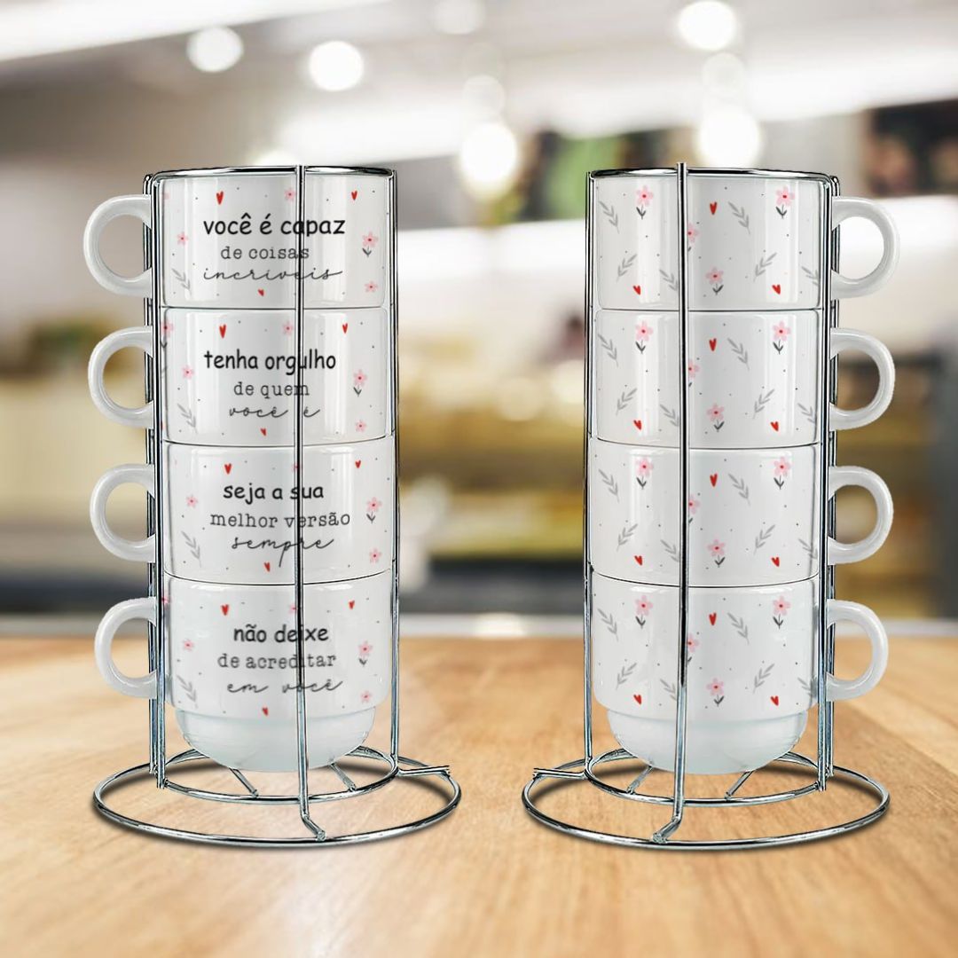 Kit Torre de 4 Xícaras 150ml c/Suporte de Metal – Frases motivacionais